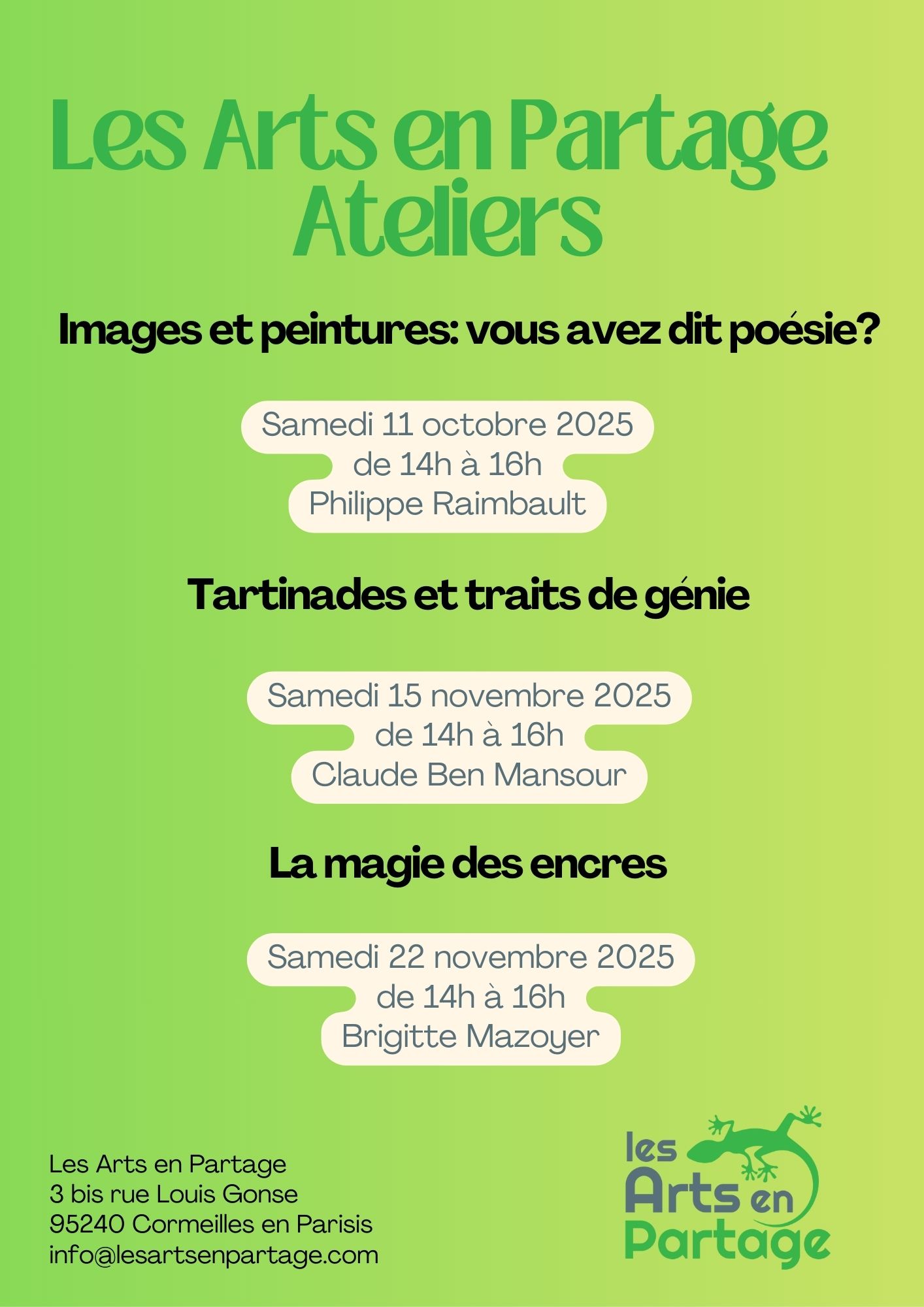 Pour la fin de l’année 2025, Les Arts En Partage a prévu trois ateliers passionnants: