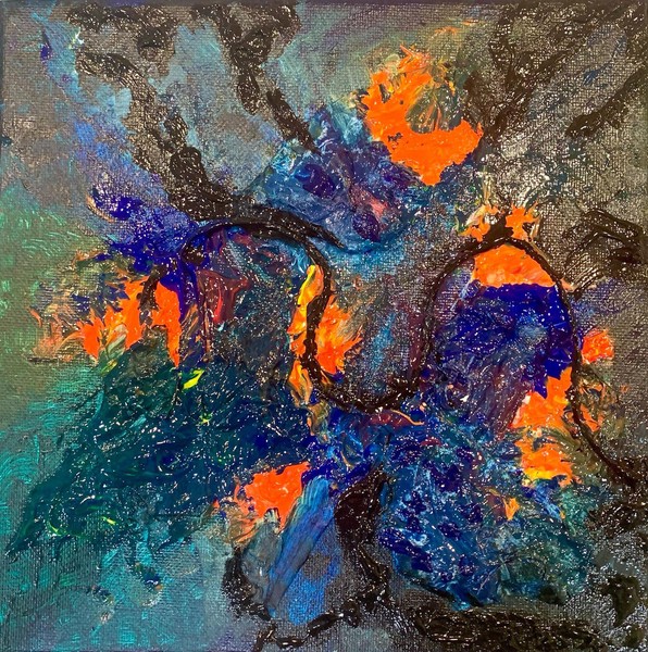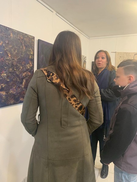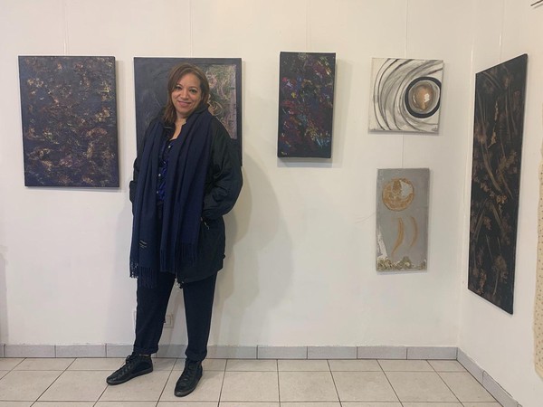 Samira nous invite à rêver grâce à ses toiles, où le volume donne de la profondeur et l’utilisation fréquente du doré un éclat particulier. Ses toiles nous font voyager dans un univers stellaire composé principalement de formes arrondies et de jaillissements. Elle aime à préciser qu’elle travaille avec du matériel de récupération, comme celui qu’elle a mis à notre disposition.
