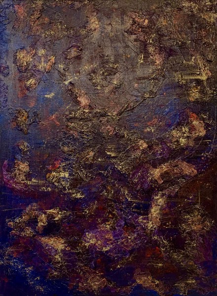 Samira nous invite à rêver grâce à ses toiles, où le volume donne de la profondeur et l’utilisation fréquente du doré un éclat particulier. Ses toiles nous font voyager dans un univers stellaire composé principalement de formes arrondies et de jaillissements. Elle aime à préciser qu’elle travaille avec du matériel de récupération, comme celui qu’elle a mis à notre disposition.